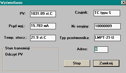 Opcja Wyświetlanie udostępnia możliwość odczytu na bieżąco wyników pomiarów wykonywanych przez przetwornik: