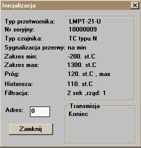 Okno Inicjalizacja włącza sie automatycznie po uruchomieniu programu. W ten sposób program odczytuje dane z przetwornika informujące o jego typie, numerze seryjnym oraz o zaprogramowanych parametrach: typie czujnika, zakresie przetwarzania, ustawionym progu i filtrze.