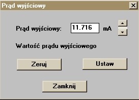 Opcja Prąd wyjściowy pozwala ustawić stałą wartość prądu na wyjściu przetwornika. Należy ją wpisać w okienku edycyjnym i kliknąć klawisz 'Ustaw'. Aby powrócić do normalnego trybu pracy przetwornika należy kliknąć klawisz 'Zeruj'.