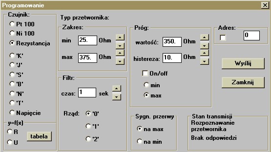 Opcja Programowanie pozwala w prosty sposób na skonfigurowanie przetwornika. Za jej pomocą można ustawić następujące parametry: